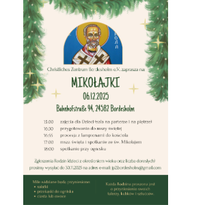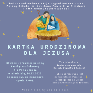 Stwórz i przynieś ze sobą kartkę urodzinowa dla Pana Jezusa w niedzielę 14.12.2025 na Msze św. do Elmshorn na godz. 09.00. Akcja adresowana jest do wszystkich parafian, a szczególnie do dzieci